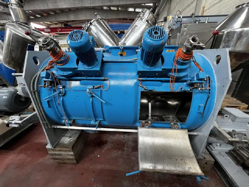 Mélangeur à palette en acier inoxydable 316 d'une capacité de 15 000 litres. - Volume - Volume total: 15000 L - Matériel - Acier inoxydable 316/316L - Caractéristiques techniques - Modèle: FKM 15000D - 12ZF - Moteur 1 - 160 kW - Informations pour le transport - Longueur: 9500 mm - L
