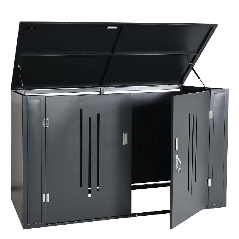 Les portes verrouillables garantissent une grande sécurité et vous donnent l'assurance que vos vélos sont protégés. Le couvercle s'ouvre facilement par le haut, ce qui permet de remplir facilement le garage. Grâce au ressort à gaz hydraulique, l'ouverture et la fermeture du couvercle se font sans effort.