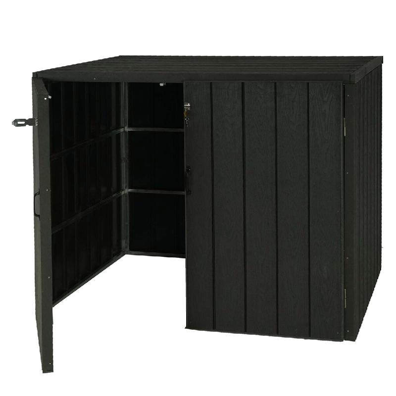 Abri de poubelles extérieur conteneurs à ordures extensible 117x142x102 cm aspect métal bois, extensible anthracitePour poubelles d'une capacité de 80 à 240 litresConvient pour deux bacs normaux ou un grand bac par section soit jusqu'à 4 bacs pour les 2 sectionsNormes sociales BSCI vérifiées