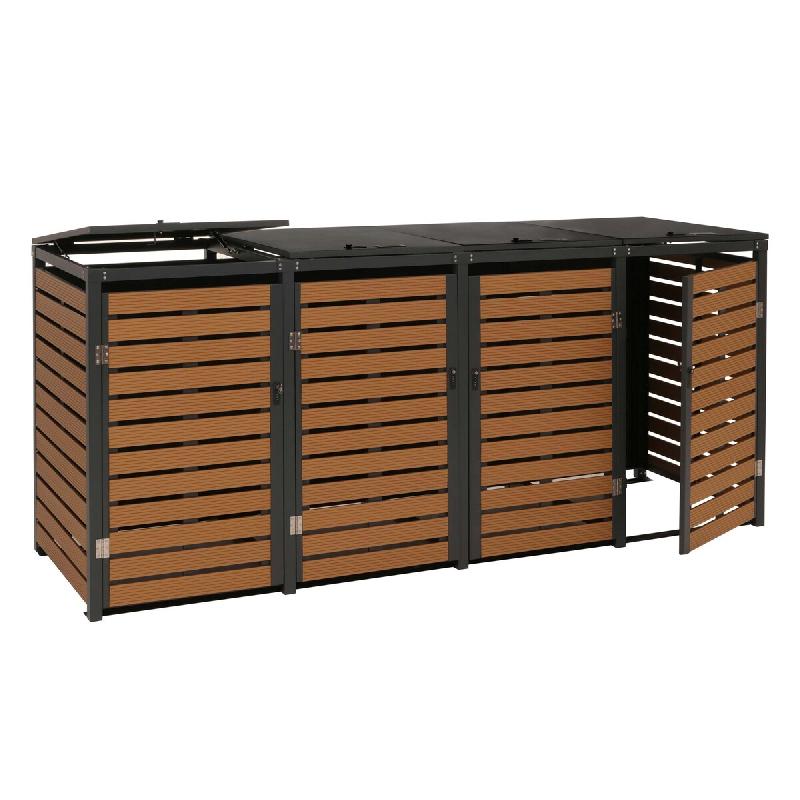 Abri de poubelles extérieur conteneurs à ordures jusqu'à 4 bacs en aspect bois métal marronPour poubelles d'une capacité de 80 à 240 litresConvient pour deux bacs normaux ou un grand bac par compartiment soit 4 bacs pour les 2 compartimentsNormes sociales BSCI vérifiéesLogement stableAvec po
