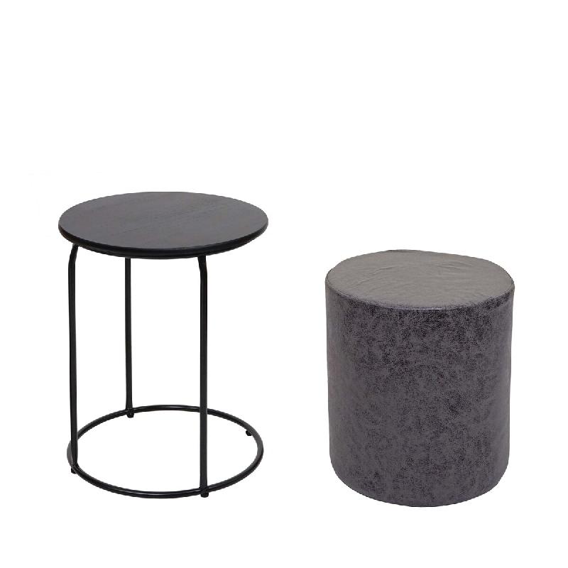 - La table d'appoint avec son piètement en fer et son plateau en MDF offre de la place pour les boissons, les snacks ou les petits objets. Le pouf en similicuir facile à entretenir est un siège confortable ou un tabouret de pied et peut être rangé sous la table pour gagner de la place.