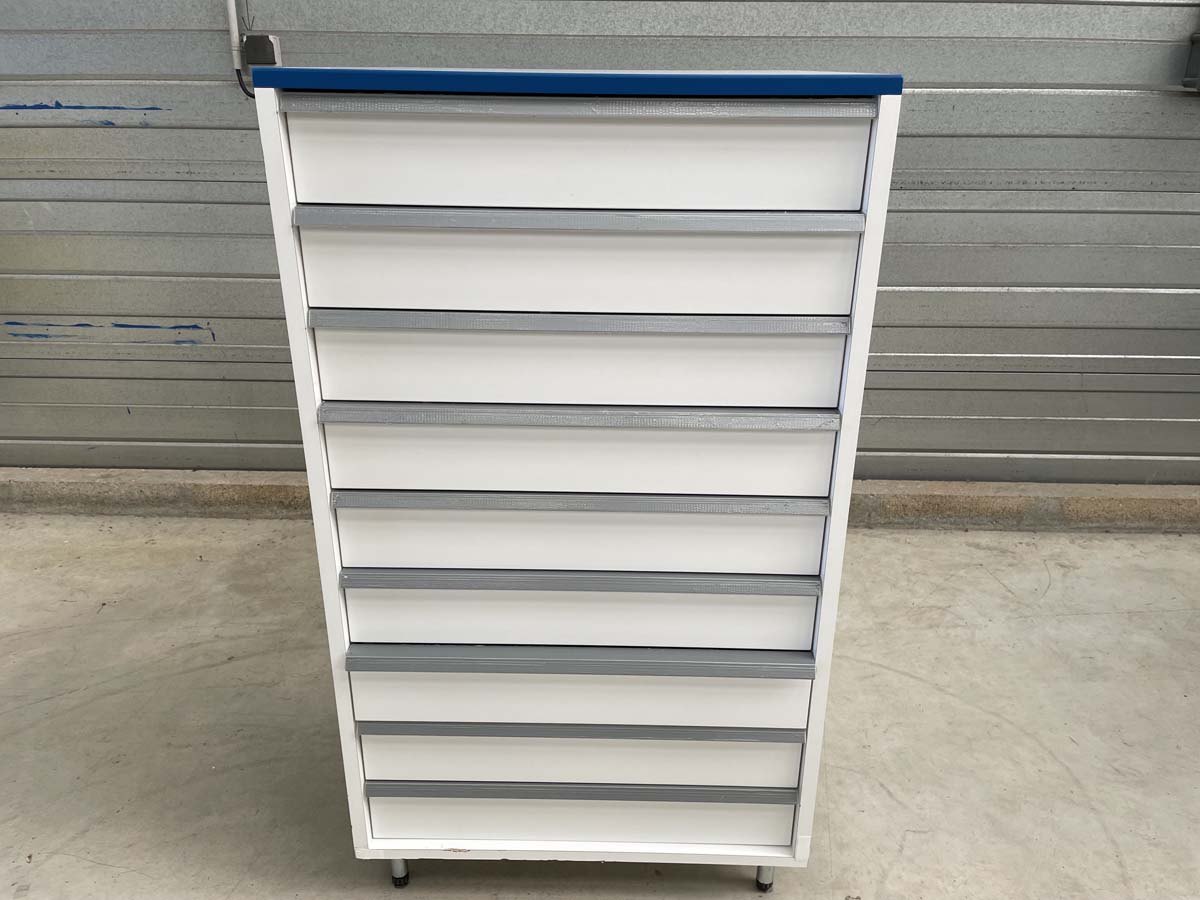 MEUBLE D'OCCASION DE LABORATOIRE AVEC TIROIRS - ATEX - Meubles : 9 tiroirs - Structure : Sur pieds métal - Référence : P21091152 - Condition : Occasion -