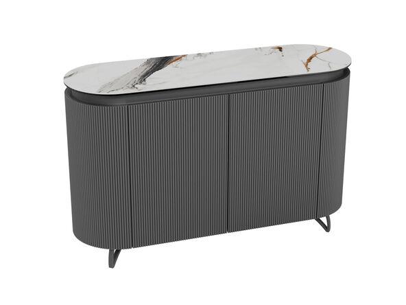 Meuble de service Onyx. Dimensions L130 P45 H81 cm. Piètement en acier laqué noir. Plateau en céramique.