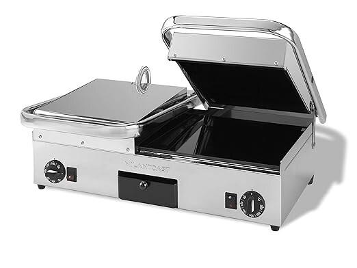 Plaque inférieure lisse, plaques supérieures lisse + lisse - Surface de cuisson : 59 cm x 28 cm - Plaque sandwich à usage professionnel avec des plaques de cuisson en vitrocéramique épaisse à haute résistance thermique et structure en acier inoxydable pour garantir une longue durée, une grande surface de travail et une vitesse de chauffe très élevée grâce aux éléments chauffants à infrarouge (300°C en 3 min. 1/2) pour une plus grande performance et une plus grande polyvalence lors de la cuisson. Facile à utiliser, avec un contrôle de la température par thermostat en acier inoxydable jusqu'à plus de 300°C, un interrupteur marche/arrêt avec voyant lumineux et un bouton ergonomique soft-touch. Faible consommation d'énergie grâce au système de chauffage efficace et à l'excellente isolation. Facile à nettoyer : cette plaque de cuisson est extrêmement facile à nettoyer grâce au matériau antiadhésif en vitrocéramique qui permet de cuire les œufs, les légumes, la viande et le poisson, avec la raclette de nettoyage incluse. De plus, les surfaces de cuisson lisses facilitent encore le nettoyage. Plaque supérieure lisse équilibrée et réglable, pression de contact variable et évacuation des graisses à la base facilitée par la légère inclinaison. Cette plaque de gril électrique est également équipée d'un bac à graisse et à miettes pratique et lavable au lave-vaisselle. SURFACE DE CUISSON : 59 cm x 28 cm - DIMENSIONS : 64 x 48 x 21 cm - PUISSANCE ABSORBÉE : 2,99 Kw - POIDS : 21,5 kg - LONGUEUR DU CÂBLE : 1,5 m - ALIMENTATION : 230 V 50 & 60 Hz.