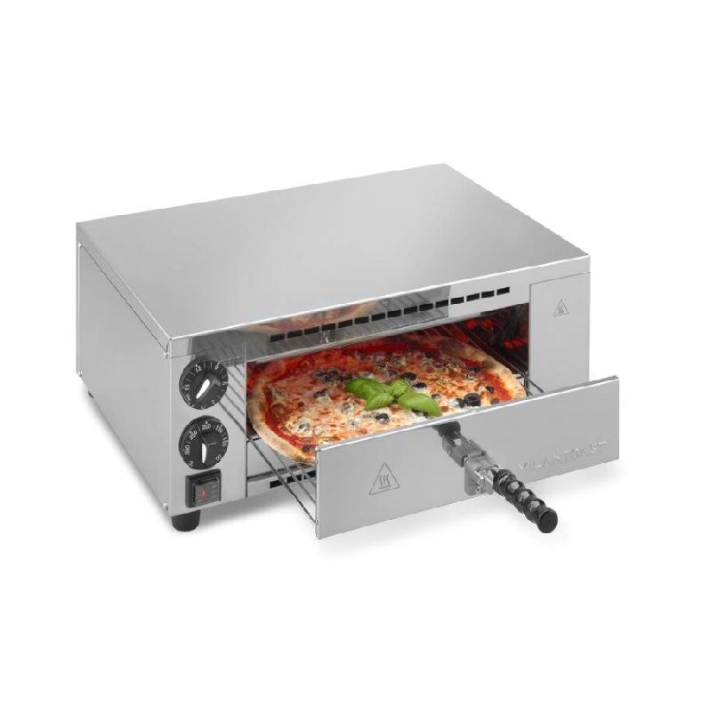 - Acier inoxydable - Capacité : 1 pizza Ø 35cm - Dimensions de la chambre : 410 x 370 x 90 mm - Pierre amovible en céramique réfractaire rainurée - Éclairage intérieur - Minuteur de 15 minutes - Thermostat de régulation jusqu'à 300°C - Puissance : 2 000 W / 230 V - Dimensions : L 585 x P 545