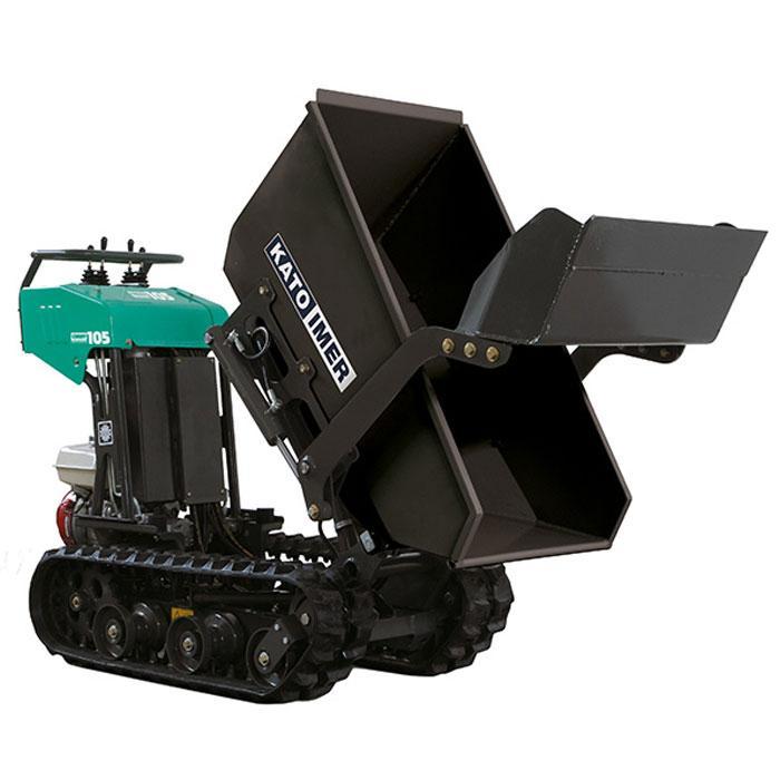 Mini transporteur CARRY 105 C. Applications : Le plus compact de la gamme des CARRY , avec une largeur de 690 mm, qui lui permet de se faufiler partout. Il est avant tout destiné aux professionnels. Avantages : 2 moteurs de chenilles indépendants. Équipé de 3 pompes qui permettent une utilisation indépendante du déchargement de la benne et de la pelle chargeuse de la traction. Moteur facile d'accès. Équipements de série : Console de commande. Commandes hydrauliques. Hydrostatique. Moteur essence HONDA GX 200, 4,7 kW. Pelle chargeuse.