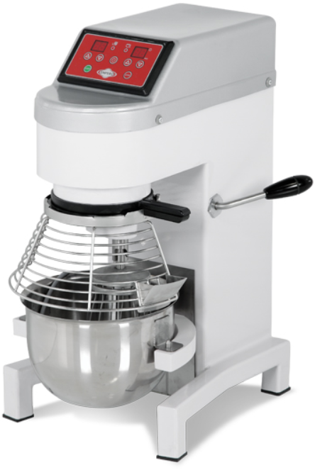 Le mixeur planétaire est équipé de ses accessoires (fouet, bras à mélanger plat et bras à crochet). Ce mixeur existe en quatre modèles : 10, 30, 40 ou 60 litres. Idéal pour les professionnels de la boulangerie et pâtisserie. Fabrication européenne.