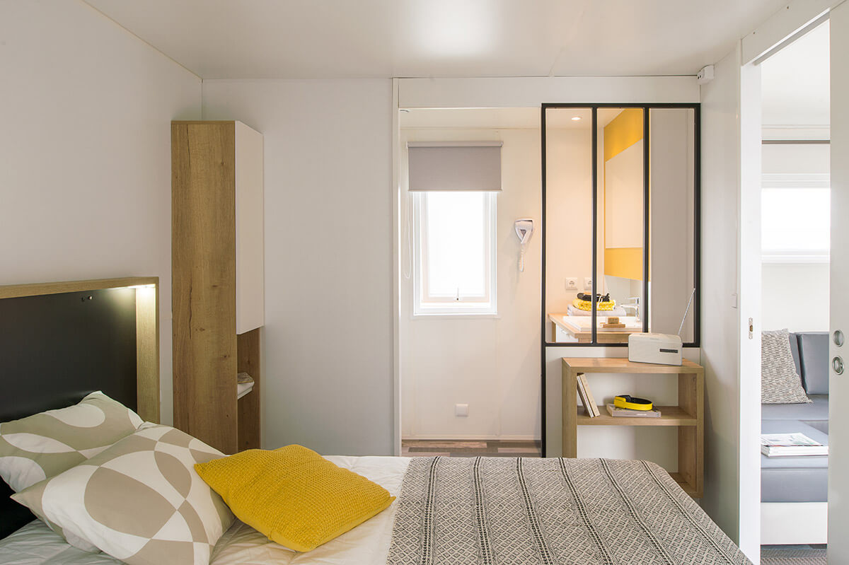 Description : - Grand modèle en 3 chambres - Le confort comme à la maison - Ambiance intérieure : - 2 coloris au choix : ambiance lagon ou ambiance nature - canapé en tissu 100% polyester - rideaux dans la chambre et le séjour avec doublure occultante - voilage aux fenêtres des chambres