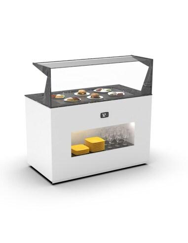 Vitrine chaude fermée avec : - Vitre bombée basculante - Éclairage halogène intégré - Plan de présentation incliné à 5° - Profondeur utile : 700 mm - Caractéristiques : - Régulation électronique de la température - Remplissage en eau automatique - Hygrométrie contrôlée - So