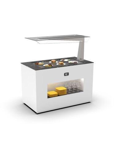 Vitrine chaude fermée avec : - Vitre bombée basculante - Éclairage halogène intégré - Plan de présentation incliné à 5° - Profondeur utile : 700 mm - Caractéristiques : - Régulation électronique de la température - Remplissage en eau automatique - Hygrométrie contrôlée - So