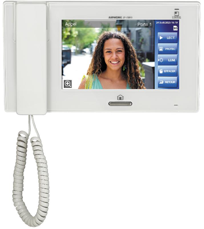 868483 - Le moniteur maître JP4MED de la marque Aiphone est équipé d'un écran tactile 7" qui affiche l'image d'une caméra couleur à grand angle 170°, offrant une vision large et détaillée de l'environnement extérieur. Le système permet également un zoom ciblé sur 9 zones, pour visualiser un visiteur hors du champ central ou identifier un détail spécifique. Un mode surveillance est disponible à tout moment, sans besoin d'appel, simplement en activant la caméra depuis le moniteur.Il est conçu pour gérer jusqu'à 8 moniteurs intérieurs au sein du même logement. Chaque poste peut être nommé selon sa localisation (ex. : chambre parents, étage, cuisine), facilitant l'utilisation quotidienne et les appels internes. Cette configuration en fait une solution efficace pour les habitations familiales ou à étages, avec une gestion claire et centralisée des accès.Le moniteur maître de la marque Aiphone intègre une boucle magnétique au combiné, apportant une grande accessibilité aux utilisateurs appareillés. Cette fonctionnalité garantit une transmission sonore claire et adaptée aux équipements auditifs compatibles, améliorant la qualité d'échange lors des appels depuis la platine de rue. Caractéristiques techniques :Taille de l'écran : 7''Angle de vue : 170 °Zoom : 9 zonesMains-libres ou combinéJusqu'à 4 platines de rue caméra couleur et 8 moniteurs vidéoCompensation du contre-jour via touche ADJUSTCâblage : RJ45-CAT6, montage en étoile, en série ou mixte entre postes intérieursBouton moniteur avec audio pendant 1 minute (programmable)6 images par appel1000 appels en séquences vidéo 10 s sur carte SD (option)20 appels en mémoire interneAppel sélectif ou général vers un poste secondaireFonction baby-phone : monitoring platine ou moniteurTransfert d'appel : possible vers un autre poste pendant la conversationMode jour/nuit : réglage du volume sonoreAlarme : code PIN 4 chiffres, programmation du délai de mise/hors tension, report d'information d'alarmeRéglages utilisateurs : luminosité, volume de sonnerie, choix parmi 6 sonneriesDimension (H x l x e) : 145 x 255 x 48 mm