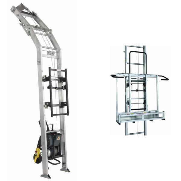 Monte - matériaux de chantier à échelles emboîtables en profil aluminium. - Charge utile : 200 kg - Importante largeur d'appui des échelles : meilleure stabilité - Treuil avec variateur de fréquence : démarrage en douceur, fiabilité, protection du moteur et du câble, utilisation peu bru
