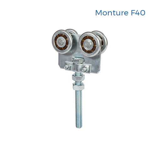Les montures doubles également appelées chariots sont utilisées lors de la mise en place d'une porte coulissante suspendue. Elles permettent de faciliter l'ouverture et la fermeture de la porte en se déplaçant sur le rail supérieur. Elles sont composées de 4 roues en nylon ou en acier. - Plu