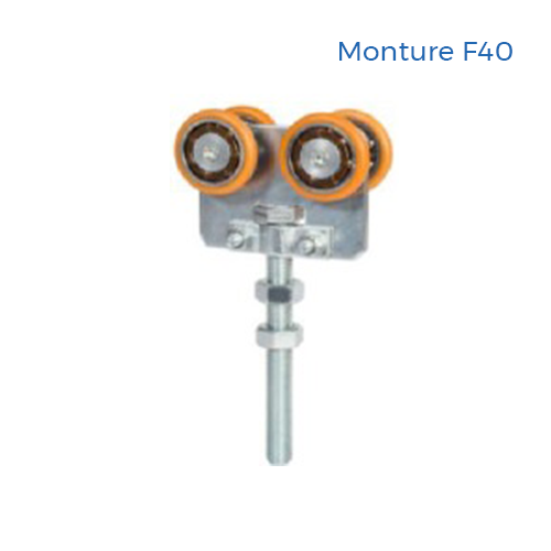 Les montures doubles également appelées chariots sont utilisées lors de la mise en place d'une porte coulissante suspendue. Elles permettent de faciliter l'ouverture et la fermeture de la porte en se déplaçant sur le rail supérieur. Elles sont composées de 4 roues en nylon ou en acier.