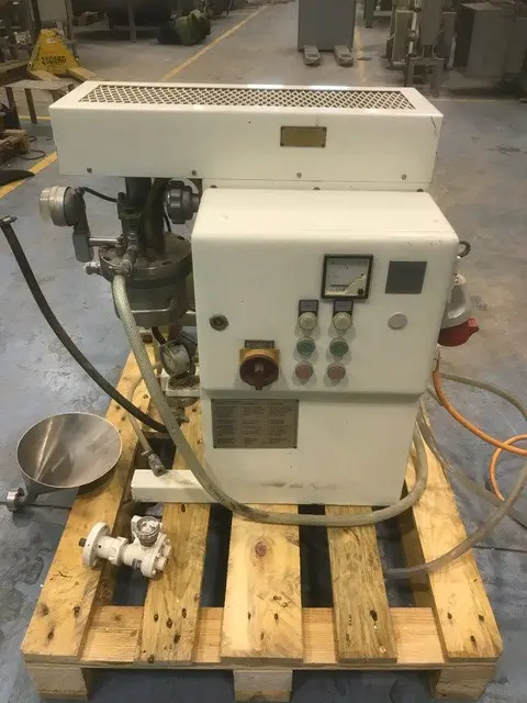 Broyeur MS-12 fabriqué par Fryma en 1990. Caractéristiques générales : Débit d'eau : 3000 L/h Raccordement eau : 2-8 bar Pression de la zone produit : 2,5 bar Pression de la zone de chemise : 2 bar Volume de la zone produit : 0,5 L Température maximale : 80 Matériau de la zone de produit : AISI 420 (1.4034) MatérielA déterminerÉtatDans son étatFabriqué parFabricant inconnu