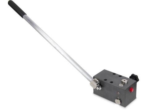 Pompe à main 700 bar VM2 Pompe à main simple effet P462, bi - étagée, avec une capacité d'huile de 7423 cm³. Caractéristiques techniques : - Pression nominale : 1er étage : 14 bar, 2ème étage : 700 bar - Débit par course : 1er étage : 126,2 cm³, 2ème étage : 4,75 cm³ - Effort maxi