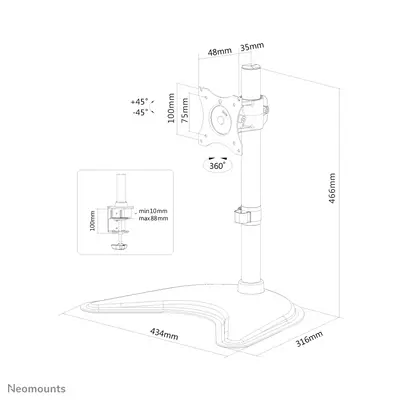 La technologie de Neomounts, inclinaison de 90°, rotation de 360° et pivot de 180°, permet au montage de changer l'angle de vue pour profiter pleinement des capacités de l'écran. Le montage est facile, réglable en hauteur jusqu'à  46 centimètres. Profondeur réglable 8 centimètres. Une gestion des cbles unique cache et achemine les cbles pour garder le lieu de travail bien rangé.