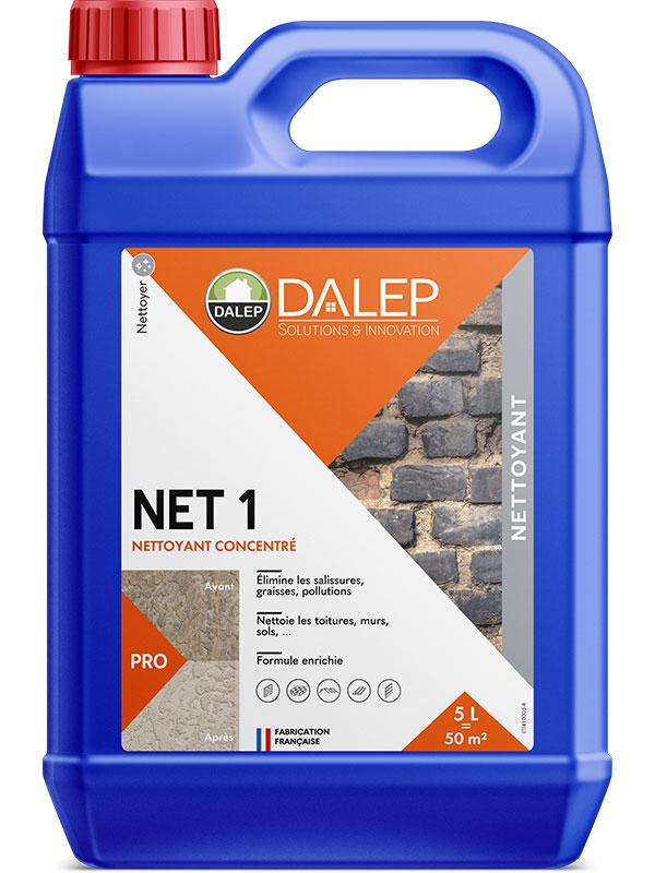 863602 - Puissance et polyvalence au service des surfaces :Le NET 1 de la marque Dalep est un nettoyant concentré à diluer qui offre une solution puissante pour les besoins de nettoyage en profondeur. Sa formule alcaline enrichie permet d'éliminer efficacement les salissures, graisses, huiles, suies et autres pollutions incrustées. Idéal pour les façades, murs, sols, toitures, dallages ou encore clôtures, ce produit est une véritable arme contre les taches tenaces sur toutes les surfaces extérieures résistantes aux produits alcalins.Une formule concentrée pour un nettoyage efficace :Grâce à sa formule concentrée, le NET 1 garantit un rendement optimal. En effet, une dilution de 1 litre dans 5 à 20 litres d'eau suffit pour couvrir jusqu'à 10 m², permettant ainsi un nettoyage économique et performant. De plus, en seulement 20 minutes d'action après une application par pulvérisation, il redonne à vos surfaces leur éclat d'origine. Ce nettoyant agit également comme rénovateur, préparant les supports pour une éventuelle peinture après séchage complet, et permet le nettoyage des taches de graisse en sorties de VMC sur toiture.Respectueux de la nature et des matériaux :Conçu sans phosphate ni solvant, le NET 1 respecte autant l'environnement que les surfaces. Sa formule puissante mais sans danger en fait un choix idéal pour un entretien en profondeur sans compromis sur la sécurité des matériaux. En somme, que ce soit pour des taches de graisse sur une toiture ou des suies incrustées sur des murs, ce nettoyant polyvalent est la solution idéale pour une propreté durable. Caractéristiques techniques :Application par pulvérisationSortie de VMCConcentré à diluer : 1 l + 5 à 20 l d'eau = 10 m²Action en 20 minutesComposition : contient parmi d'autres composants (règlement CE N°48/2004) : composés alcalins minéraux : moins de 15 %, agents de surface non ioniques : moins de 5 %, EDTA & sels : moins de 5 %