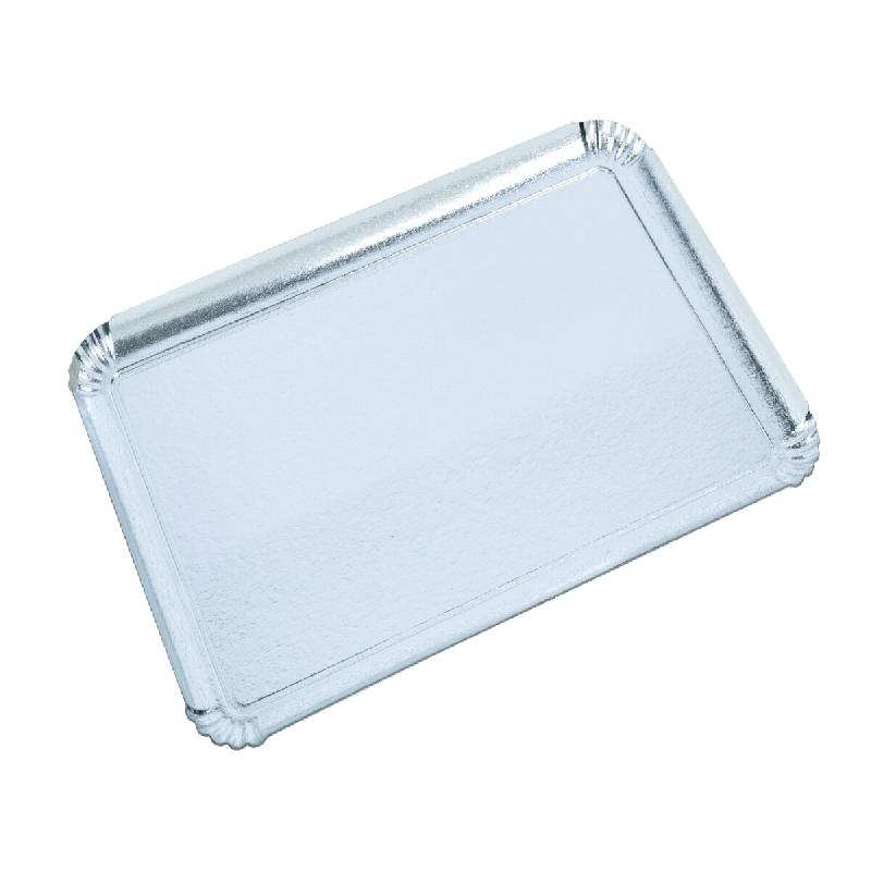 Plateau en carton avec face argent valorisant tout type d'utilisation : traiteur sucré ou salé, viennoiseries, pâtisseries. Carton haute rigidité permettant un transport et une manipulation aisés. Ingraissable et nettoyable.