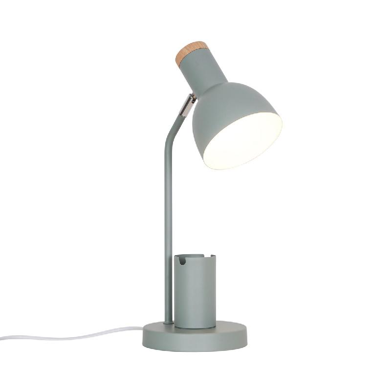 Devone est la lampe de bureau parfaite pour les chambres d'enfants grâce à son design raffiné, son rangement pour crayons et son support pour téléphone. La lampe Devone est fabriquée en métal avec une partie supérieure en bois et possède une tête de lampe flexible qui la rend idéale pour