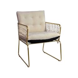 Apportez une touche de douceur à votre intérieur avec le fauteuil MUNIO en bouclette Teddy écru et ses pieds en métal doré assure un look ultra-contemporain. Chic dans sa couleur immaculée, tendance avec son piétement fin en métal doré, confortable avec son rembourrage généreux, ce fauteuil deviendra vite la pièce centrales de votre déco ! Description : Fauteuil avec coussin réversible d'un côté en bouclette teddy Ecru et de l'autre en velours lisse noir, avec pieds en métal doré. Livré monté. Confort : Garnissage assise : mousse 100% polyuréthane(densité 25kgs/m3) Garnissage dossier : mousse 100% polyuréthane (densité 25kgs/m3) Structure : Dossier : Structure en métal doré Assise : Structure en métal doré Accoudoir: métal doré et corde Dimensions : Totales : L65xH64xP57 cm Assise : L50xP46cm Hauteur de l'assise : 45cm Hauteur des accoudoirs : 63cm Autres détails : Poids net unitaire : 7.300 kg Poids maximum supporté : 150 Kgs Non déhoussable
