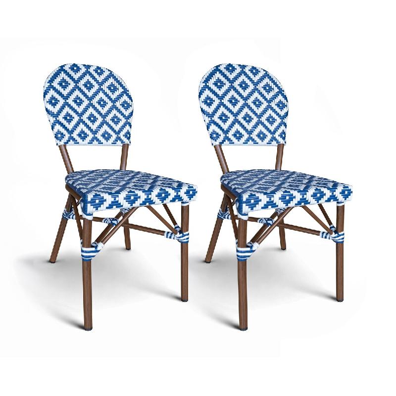 Apportez à votre véranda ou terrasse ouverte une touche de charme et de modernité avec cette chaise bistro Scala en textilène tressé bleu et blanc. Inspirée des iconiques terrasses parisiennes, elle revisite l'esprit bistrot avec des matériaux contemporains parfaitement adaptés aux espaces lumineux et ouverts. Sa structure en aluminium effet rotin couleur noyer offre toute la chaleur et l'authenticité du rotin traditionnel, sans ses contraintes. L'aluminium garantit légèreté, solidité et résistance à l'humidité, un atout essentiel pour une véranda exposée aux variations de température et à la condensation. Description : Chaise en textilène tressée bleu et blanc avec structure en aluminium imitation rotin. Livré monté. Structure : Aluminium aspect rotin Couleur : effet noyer Dimensions : Totales : 41x43xH87cm Hauteur de l'assise : cm Assise : textilène tressé Couleur : bleu et blanc Dossier : Textilène tressé Couleur : bleu et blanc Autres détails : Poids net unitaire : 3 kg Empilable : oui Intérieur/ extérieur Poids maximum supporté : 110 kg Vendue en lot de 2