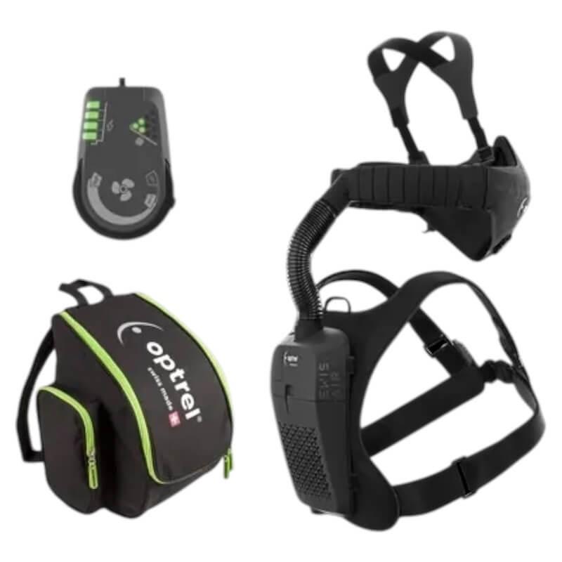 Le Swiss Air noir Optrel se distingue clairement des systèmes classiques : ici, pas de cagoule intégrée obligatoire. Le système repose sur une ventilation assistée portée à la ceinture qui alimente en air filtré une demi-masque ou un système léger.