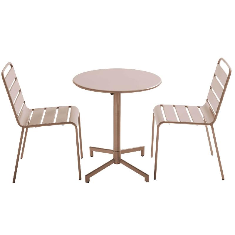 Offrez-vous des instants de détente au jardin avec cet ensemble table et chaises coordonnées, parfait pour les beaux jours de l'été ! Vous aimerez son style design et actuel, la ligne épurée des lattes juxtaposées des chaises qui ne manquera pas de faire son petit effet quand prendront place vos invités. Cet ensemble table et chaises PALAVAS en acier thermolaqué finition époxy offre aussi d'autres atouts de taille ! Grâce à sa fonction rabattable, la table d'extérieur se range facilement et les chaises s'empilent en un tour de main ! Tellement pratique au quotidien ! La table est équipée d'un pied central parfaitement stable pour rester en place quoi qu'il arrive. Installez-la sur la terrasse, le balcon, pour un déjeuner sur l'herbe et profitez pleinement de vos instants outdoor. Description du salon de jardin1 table de jardin ronde rabattable2 fauteuils de jardinCaractéristiques de la table de jardin :Table en acier thermolaquéPlateau carréFinition époxy anti-rouillePlateau rabattable sur le côtéPatins antidérapants Caractéristiques des fauteuils de jardin :Structure 100 % acier thermolaquéFinition époxy anti-rouilleAssise et dossier ajourésPatins antidérapantsEmpilablesDimensions de la table de jardin :Diamètre : 70 cmHauteur : 72 cmDimensions des fauteuils de jardin Palavas :Longueur : 55 cmProfondeur : 55 cmHauteur : 83 cmPoids total : 19 kgAfin de prolonger sa durée de vie, hivernez si possible votre mobilier en acier en intérieur (une cave, un garage, un abri de jardin...). Idéalement dans un endroit sec et ventilé.Nous recommandons de ne pas couvrir le produit (nappe plastifiée / sets de table). L'humidité pourrait altérer l'aspect de la peinture.