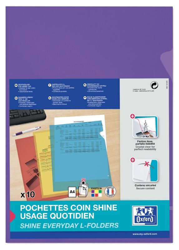 Oxford Lot de 50 Sachet de 10 pochettes coin Shine A4, en polypro lisse coloris violet - 3045050174513