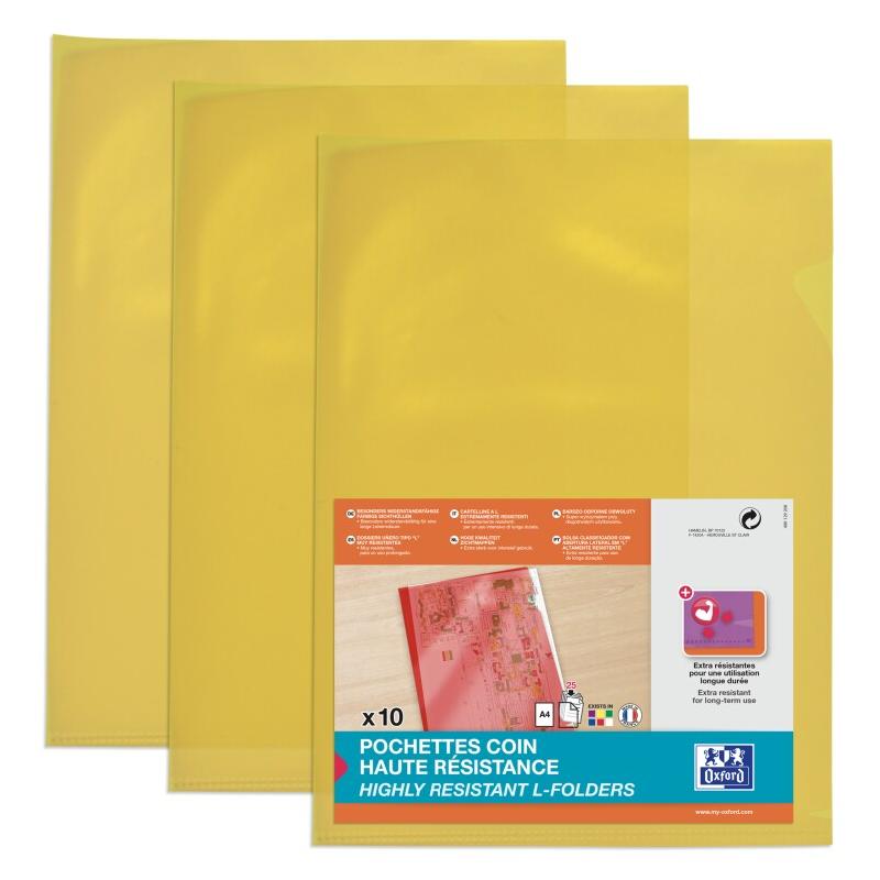 Oxford Sachet de 10 pochettes coin haute résistance A4, en PVC souple coloris jaune - 3045050022166