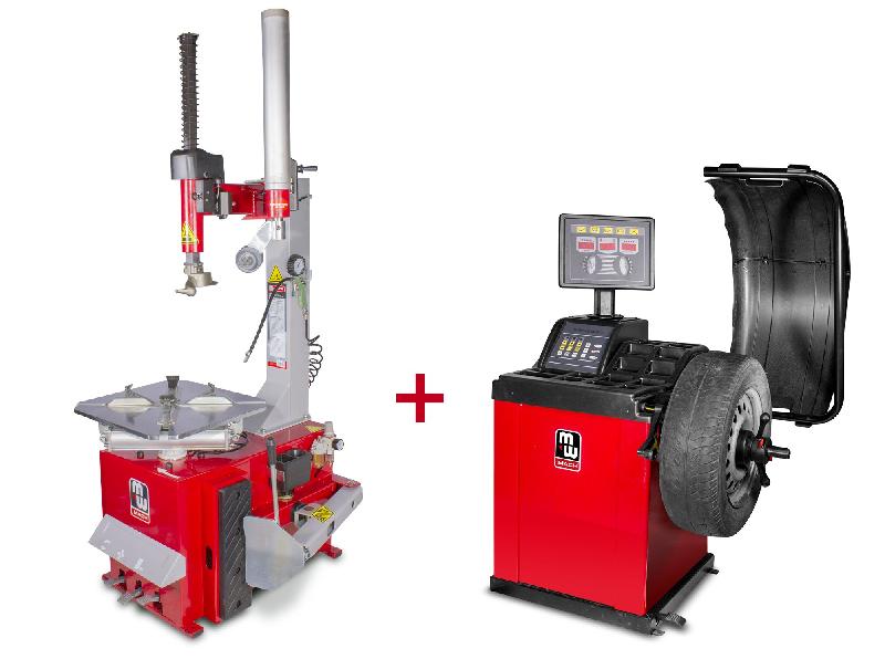 Set composé d'un démonte - pneu BT100 + une équilibreuse de roues BB350BT100 (3x400V)Caractéristiques : - Pour pneus de 10 à 24'' - Serrage manuel du bras de montage/démontage - Tête de montage pour pneus standard et profils bas - 3 pédales de commande pour le bras de montage, le plateau