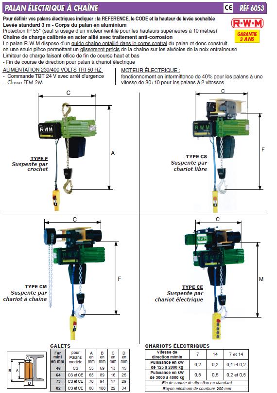 Caractéristiques principales : - Charge Maximale d'Utilisation : de 125 à 4000 kg - Classe : FEM 2M - Levée standard : 3 m - Corps du palan : en aluminium - Protection : IP 55 - Chaîne de charge : calibrée en acier allié avec traitement anti - corrosion - Le palan RWM dispose d'un guide