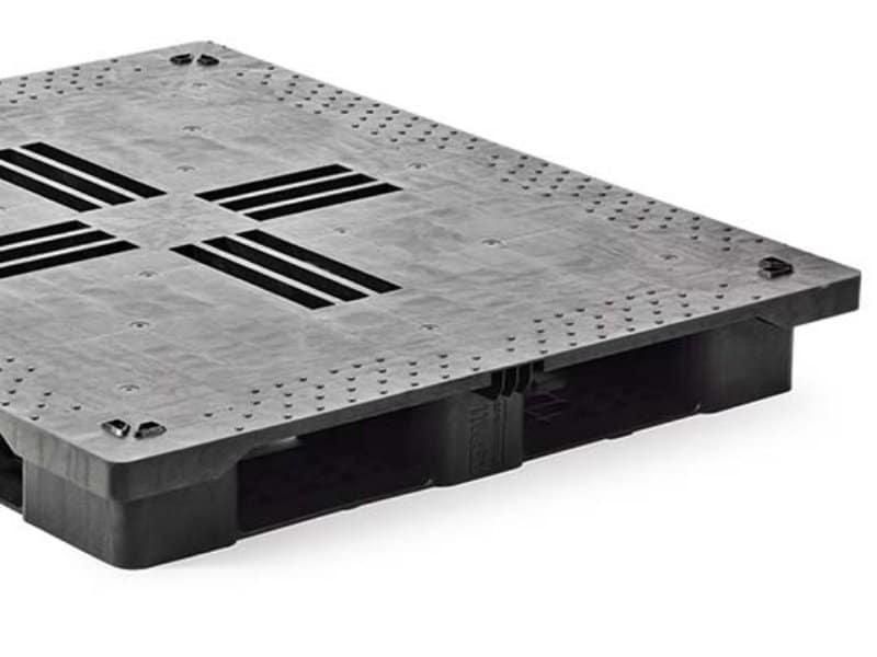 Palette médium robuste, réutilisable, avec cales de maintien aux angles, plateau fermé et antidérapant. - 3 semelles - Plastique de qualité et recyclable, stable. - Caractéristiques : - Matière: REGULAR (pool palette/rotation) - Détail matière: MIX HDPE - Couleur: noir - État: - Di