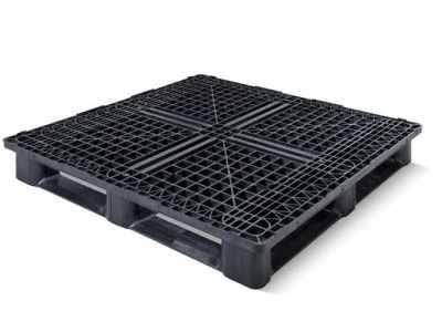 Palette plastique de 1200 x 1200 mm, adaptée à des charges moyennes allant jusqu'à 4000 kg. Fabriquée en PEHD recyclé noir, c'est une palette très robuste, et idéale pour l'exportation en conteneurs maritimes.Cette palette plastique ergonomique et emboîtable supporte 4000 kg en charge sta