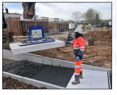 Le LF2T est un palonnier autonome fonctionnant sur batterie rechargeable équipé de 3 ventouses joint mousse pour manutentionner des éléments en béton préfa Â