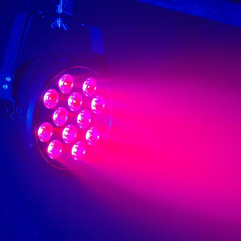 PAR à LED plat disposant de 12 LED de 12 W 6-en-1 RGBWA-UV et d'une télécommande IR.