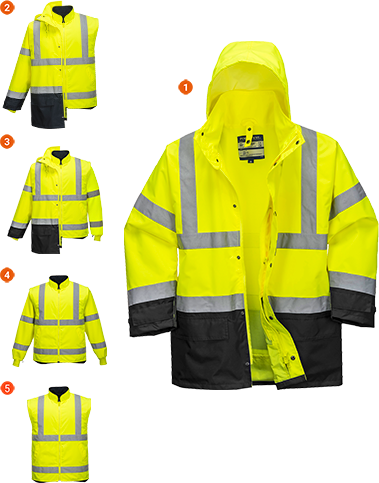 - Certifications : - Certifié CE - EN ISO 20471 Class 3 - ANSI/ISEA 107 - 2015 Type R Class 3 - AS/NZS 4602.1:2011 Class D/N - EN 342 : 0.352 (m².K/W) 2 - EN 343:2019 Class 3:1 WP 15000mm - Caractéristiques principales : - Parka 5 - en - 1 - Couleur : jaune/gris - Capuche détachable -