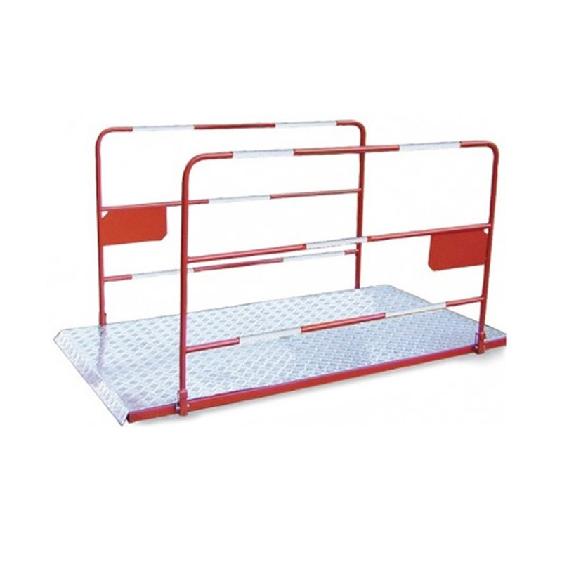 Passerelle en acier galvanisé avec barrière rouge et blanche. - Longueur (m) : 2/3 - Largeur (m) : 1,2/1 - Epaisseur (mm) : 10/10 - Poids (en Kg) : 61/102