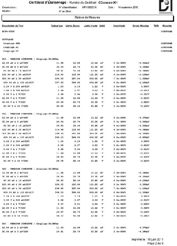 Certificat d'étalonnage pour multimètre MTX3290 - Marque : FI - METRO