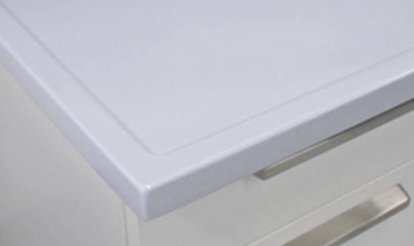 Plan de travail sur - mesure en résine de synthèse Corian de Dupont de Nemours sans joint ni angle vif à usage HOSPITALIER : - Dimensions à vos mesures : plan monobloc quelles que soient sa taille et sa forme - Nombreux coloris au choix - Equipement selon les besoins du service : plan sec ou