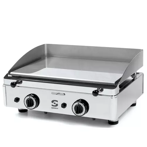 Sammic SPC - 601 plaque snack à gaz avec plaque en acier de 15 mm renforcée par du chrome dur et 2 brûleurs indépendants en acier inoxydable avec revêtement en titane. Surface utile de la plancha 555 x 400 mm pour une cuisson homogène et précise.Construction en acier inoxydable robuste et fac