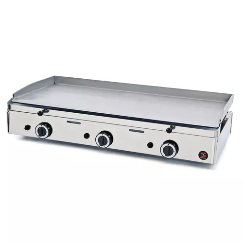 - Acier inoxydable AISI 304 - 3 thermostats réglables de 50°C à 300°C - Plaque lisse en fonte d'acier - Dimensions de plaque : L 970 x P 480 mm - Epaisseur de la plaque : 10 mm - Allumage piezo - Tiroir de récupération des liquides de cuisson - Puissance : 12 000 W gaz - Dimensions : L 990 x