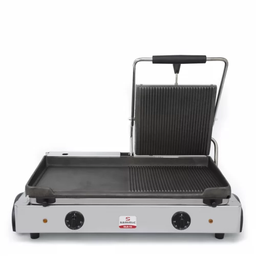 Plaque à snacker combinée avec base 1/2 lisse et 1/2 nervurée et couvercle-grill nervuré