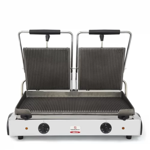 Plaque à snacker électrique mixte double en fonte. - Une moitié de la base est lisse et sans couvercle - grill, l'autre moitié est nervurée avec son couvercle - grill nervuré.Caractéristiques : - Puissance totale2900 WAlimentation électrique230 V / 50 - 60 Hz / 1~Surface de la plaque550 mm