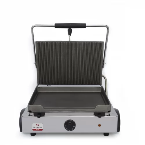 Plaque à snacker à base lisse et couvercle-grill supérieur nervuré.