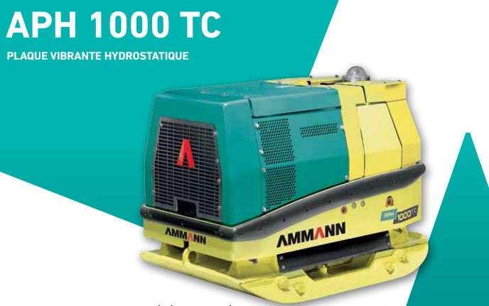 Plaque vibrante AMMANN APH 1000 - TC Caractéristiques techniques : - Poids : 715 Kg - Fréquence maximale de vibration : 46 Hz - Force centrifuge maximale : 63 kN - Hydrostatiques Plaques vibrantes (APH)