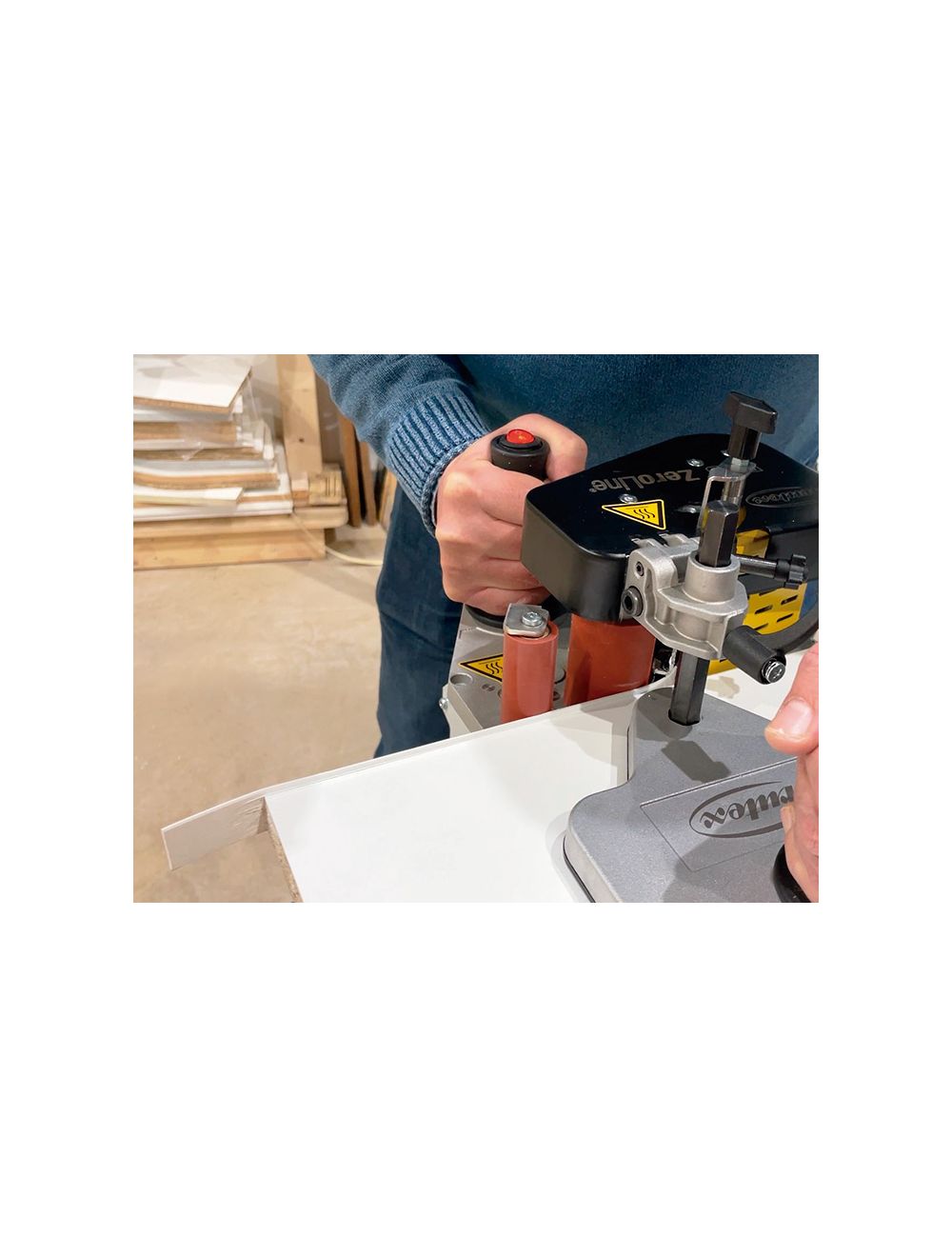 Plaqueuse de chant portative dotée de la technologie Zeroline®, par air chaud. Grâce à cette technologie, le joint entre le panneau et le chant est pratiquement parfait et quasiment invisible à l’œil nu donnant un rendu de haute qualité.