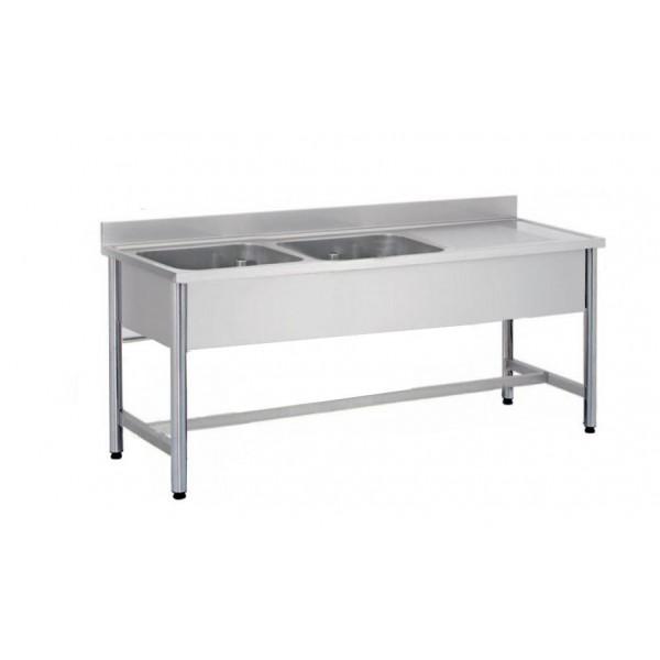 Plonge : - 2 bacs : 400x500x300 mm - 1 égouttoir à gauche - Matériau : inox - Modèle : adossée - Dimensions : 1600x700x900 mm - Équipée d'une étagère - Passage pour machine à laver -