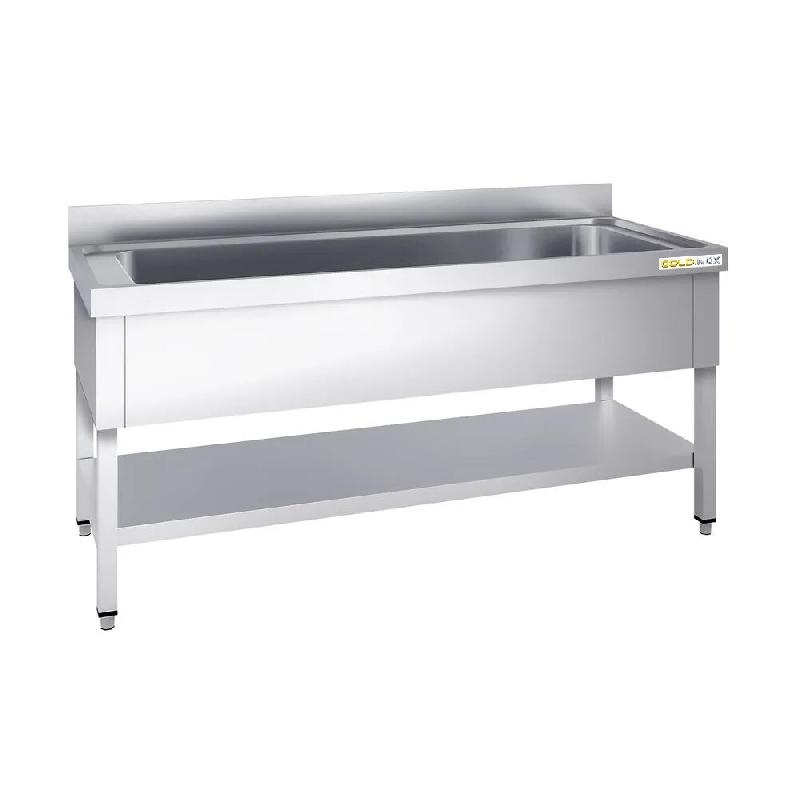 - Marque : GOLDINOX - Modèle PREMIUM - Plonge professionnelle entièrement en acier inoxydable AISI 304 - Finition soignée de haute qualité - Robuste, capacité de charge très élevée - 1 bac insonorisé au centre - Avec dosseret - Angles arrondis - Étagère en bas - Pieds de table ca