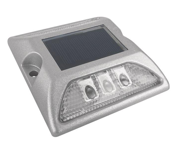 Plot routier solaire en aluminium, idéal pour sécuriser les bords de routes et les zones à risques. 3 LED blanches clignotantes sont présentes sur les deux côtés du plot, qui rendent le plot visible à plus de 500 m. La charge des LED, grâce aux bandes photovoltaïques, se fait en 8 h de jour